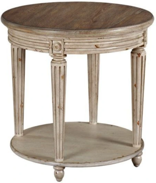 The American Drew® Southbury Wirebrushed Oak Round End Table with Off-White Base features Wirebrushed Oak Veneers and a lower shelf. This beautiful accent table makes a great compliment beside a sofa or even with a stand-alone chair.Read More