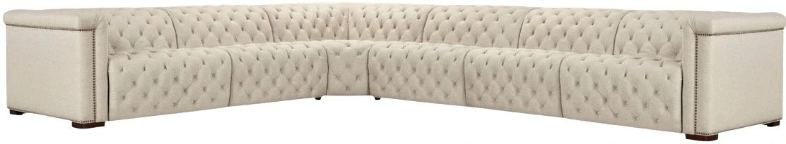 Upholstered in soft Ariés beach fabric, the Savion Deux 6-seat sectional offers four power recliners and seven power headrests, delivering a perfect combination of style and functionality. The smooth, durable fabric is complemented by dark wood accents, chesterfield tufting, and copper-toned nail trim.Read More